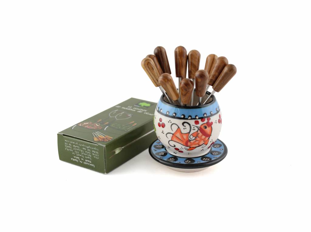 De pinchohouder van aardewerk heeft twaalf metalen pincho's met olijfhouten top. Ideaal voor het presenteren van pincho-hapjes of het prikken van olijven.