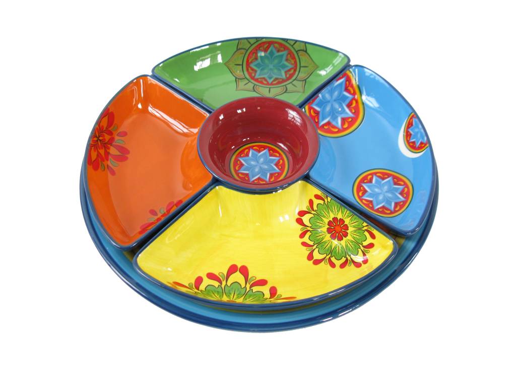 Deze schaal van aardewerk bestaat uit zes delen: een onderbord, vier schaaltjes en een dipschaaltje. Samen vormt het een mooi geheel. Je kunt hier heerlijke tapas in serveren met daarbij een zelfgemaakte dip.